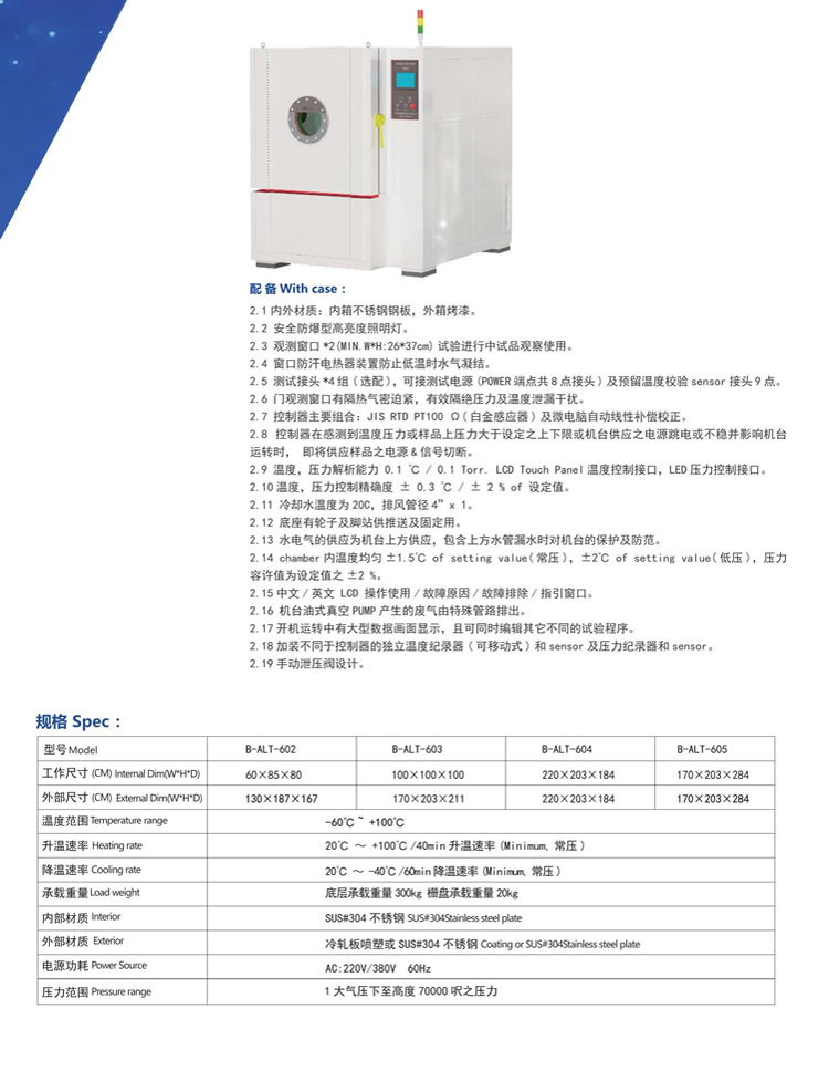 產品別名:高空低氣壓試驗箱、高低溫低氣壓試驗箱、海拔溫度濕度試驗箱、高原環境氣候倉、海拔溫度試驗室、高低溫濕熱低氣壓試驗箱、高低溫低氣壓試驗機高空低氣壓試驗箱應用于對產品(整機)、零部件、材料進行高溫、低溫,高度(不高于海拔30000米或45000米)以及高低溫循環試驗和溫度-高度綜合試驗,高、低溫試驗時本試驗箱可用于散熱試驗樣品和非散熱試驗樣品的試驗。對于散熱試驗樣品的試驗,其散熱功率不能超過試驗箱制冷量,因制冷量為動態值,其隨溫度點變化而有所變化。
