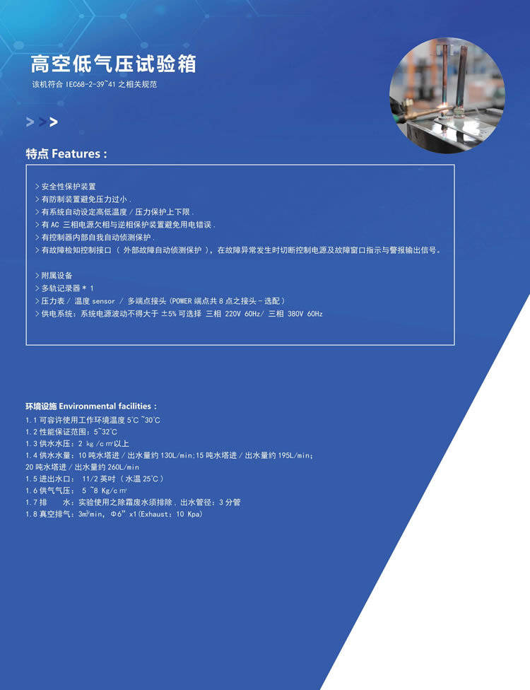 GB/T 10590-2006高低溫/低氣壓試驗箱技術條件。GB/T 2423.1-2008電工電子產品基本環境試驗規程 試驗A:低溫試驗方法。GB/T 2423.2-2008電工電子產品基本環境試驗規程 試驗B:高溫試驗方法。GB/T 2423.21-2008 低氣壓試驗方法 M。GB/T 2423.25-2008 低溫/低氣壓綜合試驗Z/AM。GB/T 2423.26-2008 試驗高溫/低氣壓綜合試驗Z/BM。GJB150.2A-2009 低氣壓(高度)試驗。GJB150.3A-2009 高溫試驗。GJB150.4A-2009 低溫試驗。GJB150.6A-2009 溫度高度試驗。GB/T 5170.1-2008 電工電子產品環境試驗設備檢測方法 總則。GB/T 5170.2-2008 電工電子產品環境試驗設備檢測方法 溫度試驗設備